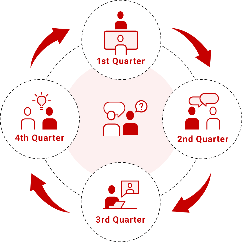 スピーディーに昇給・昇格評価機会が年1〜2回という企業も多い中、ギブリーでは倍以上にあたる年4回、四半期(Quarter)ごとの評価および昇給・昇格機会を設けています。若いから、新卒だから、という視点は全くなく、一人ひとりの市場価値の向上に見合った、柔軟でスピーディな評価と待遇を実現するための取り組みです。