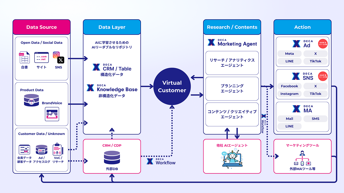 「DECA MarketingAgent」は、1st Party Dataなどの企業が保有するデータをもとにVirtual Customerを生成し、AIエージェントがその顧客像に基づいて施策の企画から実行‧改善までを支援する、マーケティング特化型AIエージェント構築プラットフォームです。