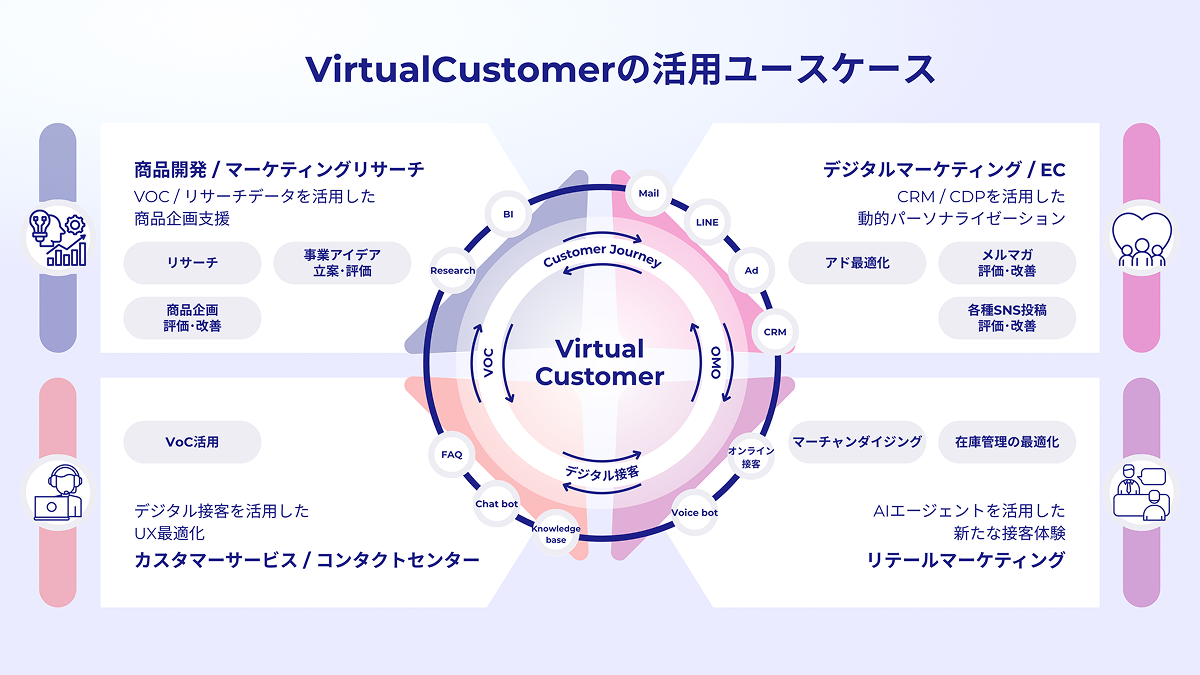 DECA MarketingAgentは、デジタルコミュニケーションにとどまらず、商品開発やカスタマーサービス、店頭施策なども含めた、マーケティング活動全体に展開可能であり、顧客体験の向上を支援します。たとえば、Virtual Customerを活用することで、マーケティングリサーチの代替も可能です。従来のリサーチは、コストや時間の負荷も高く、気軽に実施できるものではありませんでしたが、Virtual Customerを活用することで、商品コンセプトの受容性確認やデジタルマーケティングにおけるコンテンツ評価など、あらゆるマーケティング局面で顧客と対話しながら施策を進めるような状況をつくりだすことができます。