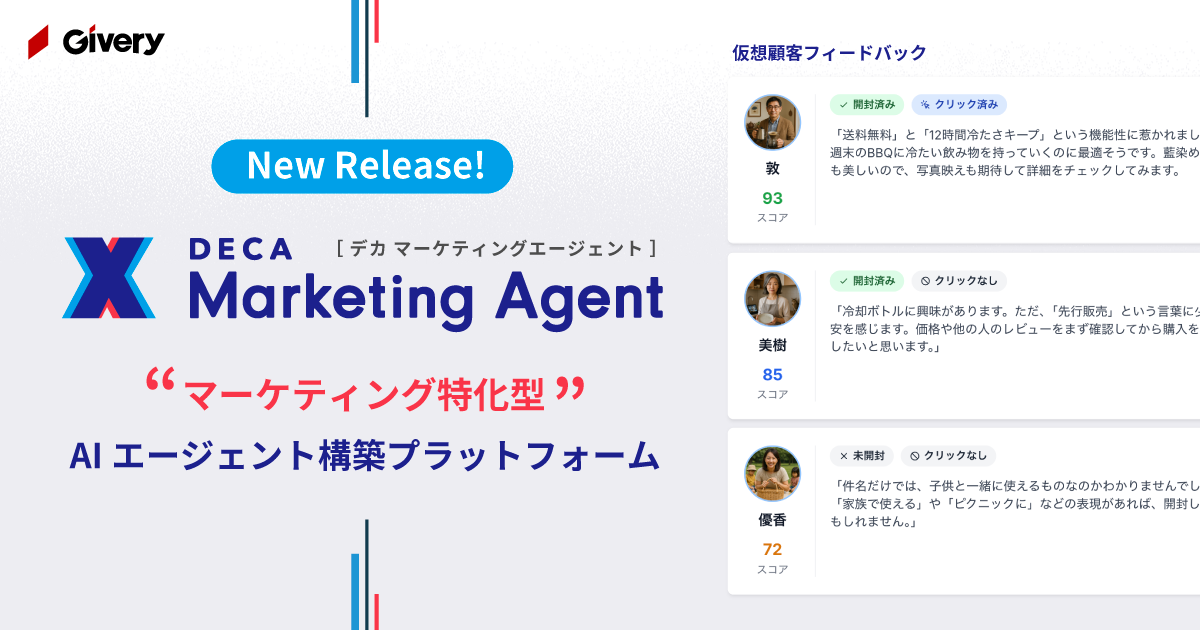 ギブリー、マーケティング特化型AIエージェント構築プラットフォーム「DECA MarketingAgent」をリリース 株式会社中川政七商店との共同検証で、仮想顧客「Virtual Customer」と人の協働により企画‧作成されたメルマガ施策において、既存施策を上回る成果に