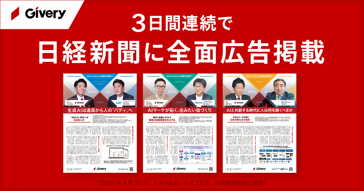 株式会社ギブリー(本社:東京都渋谷区、代表取締役 社長:井手 高志)は、2025 年 8 月 25 日から 8 月 27 日までの 3 日間、日本経済新聞(朝刊‧全国版)に、全面広告を掲載しました。