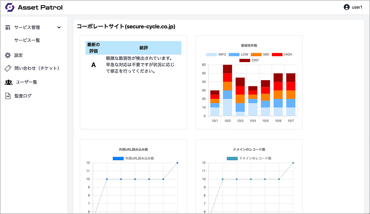 組織全体の状態を5段階で評価し、脆弱性数や資産の変化を日次で確認できます。