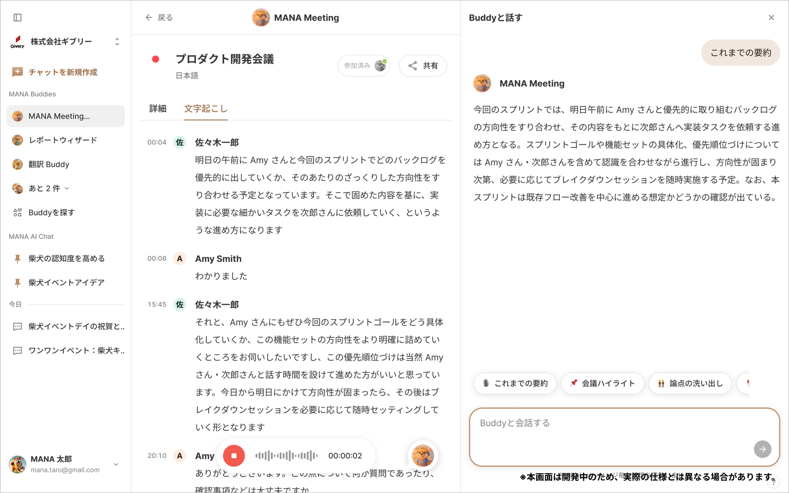 MANA Meetingは、Web会議の進行を支援するAIエージェントです。Web会議(Google Meet、Microsoft Teams、Zoom)をリアルタイムで録画と文字起こしを行い、会議内容の整理から議事録・対応事項の作成までを支援します。