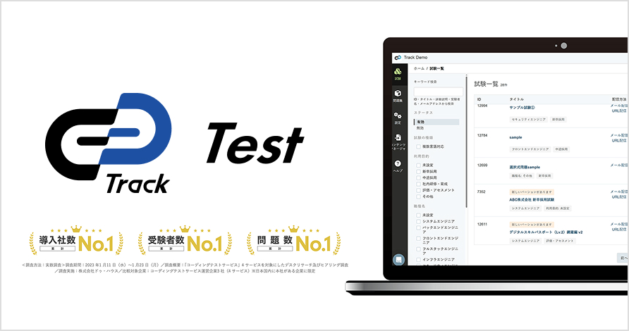 Track Testは、豊富な1000問以上の実践的なデジタルスキルを可視化する問題を組み合わせ、自社独自のアセスメントを簡単に作成・配信します。候補者から提出されたソースコードを自動採点し、レビューができる、業界No.1のスキルアセスメントツールです。